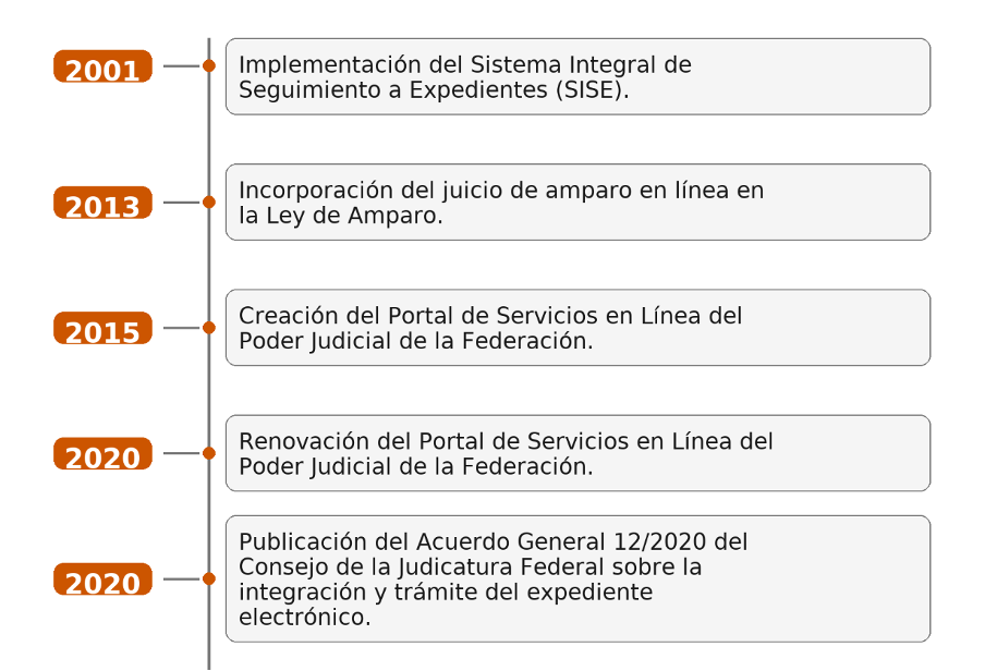 Desde entonces, se ha impulsado el juicio en línea y el expediente electrónico mediante reformas legales, acuerdos generales del Consejo de la Judicatura Federal, criterios jurisprudenciales y el desarrollo de plataformas electrónicas. La reforma a la Ley de Amparo, que está próxima a aprobarse, propone modificar los artículos 3, 25, 26, 27, 28 y 30 en los siguientes temas: uso del Portal de Servicios en Línea (Portal en Línea), notificaciones electrónicas y expediente electrónico.